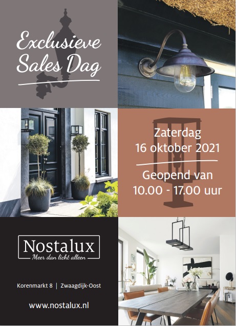 Op zaterdag 16 oktober 2021 organiseert Nostalux, de grootste buitenverlichtingswinkel van Nederland, een Exclusieve Sales Dag in haar 800 m2 grote winkel. Tijdens deze dag zijn de deuren geopend voor iedereen die op zoek is naar mooie verlichting, zich graag wil oriënteren op het gebied van binnen- en buitenverlichting of benieuwd is naar de uitgebreide collectie van Nostalux.